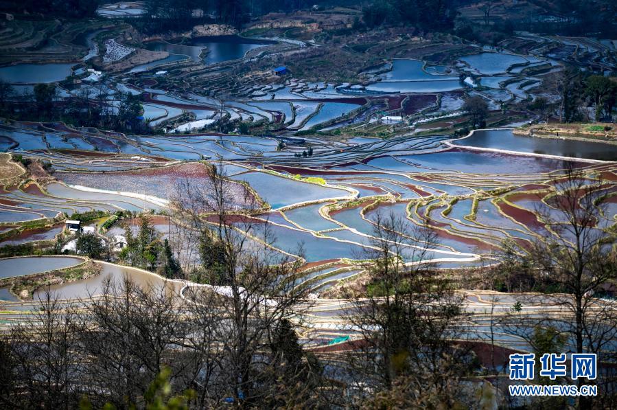 春日里,位于云南省紅河哈尼族彝族自治州元陽縣境內的哈尼梯田在不同光照條件下呈現出豐富色彩,與周邊村寨、山系等和諧相融,猶如一幅幅色彩斑斕的油畫,美不勝收。