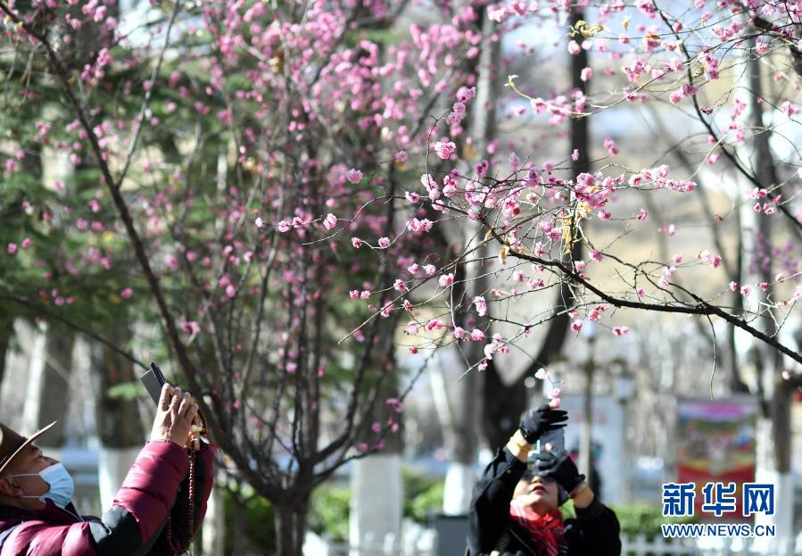 3月4日,人們在拉薩龍王潭公園賞花、拍照。