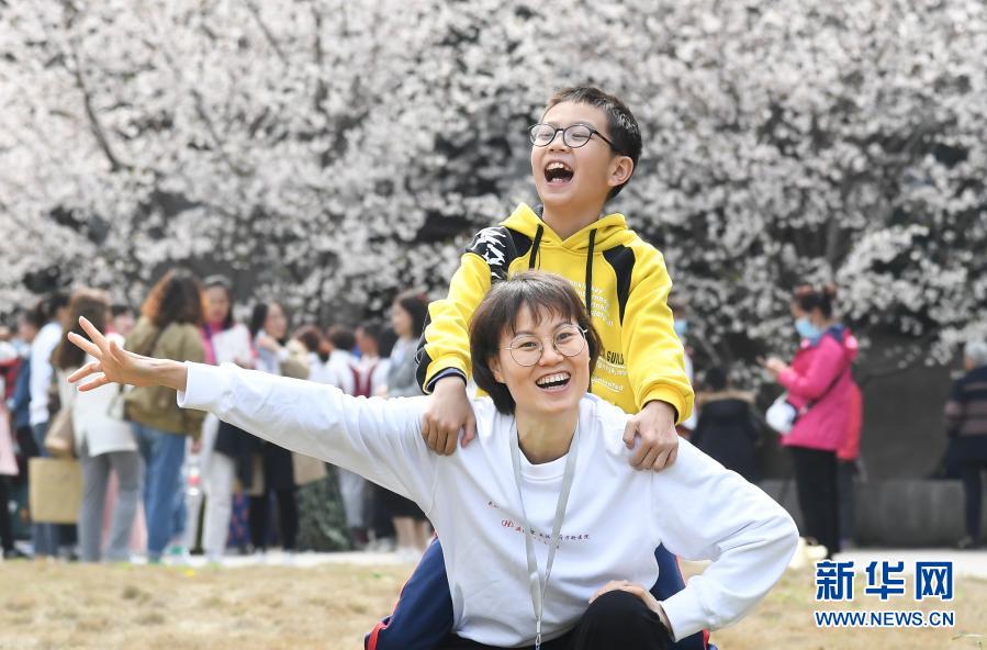 3月13日,廣東援鄂醫療隊成員梁仕鳳帶著孩子來到武漢大學賞櫻游玩。新華社記者 程敏 攝