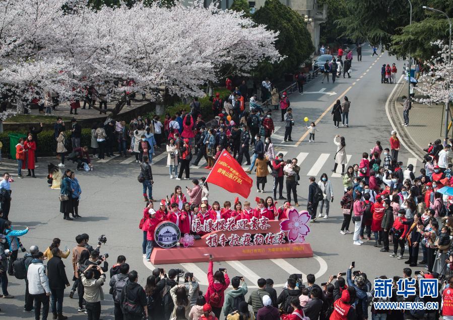 3月13日,遼寧援鄂醫療隊員在武漢大學櫻花樹下合影。新華社記者 肖藝九 攝