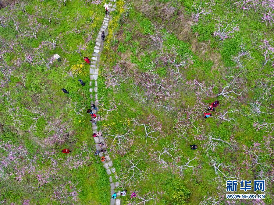 3月20日,游客在湖北襄陽襄城區尹集鄉的桃花嶺踏青賞花(無人機拍攝)。