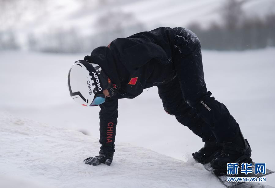 3月20日,冬殘奧會國家集訓(xùn)隊(duì)單板滑雪運(yùn)動員汪志鵬在冬殘奧會訓(xùn)練基地訓(xùn)練時(shí)摔倒后起身。新華社記者 才揚(yáng) 攝