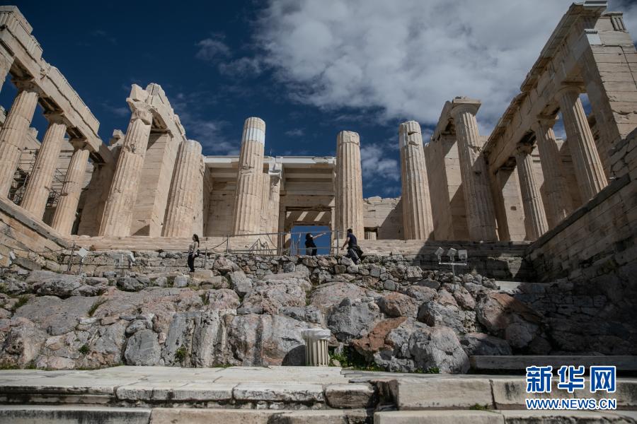 3月22日,游客游覽希臘雅典衛城。希臘露天考古遺跡22日起恢復開放。游客需遵守保持社交距離和佩戴口罩等防疫規定。新華社發(萊夫特里斯·帕察里斯攝)