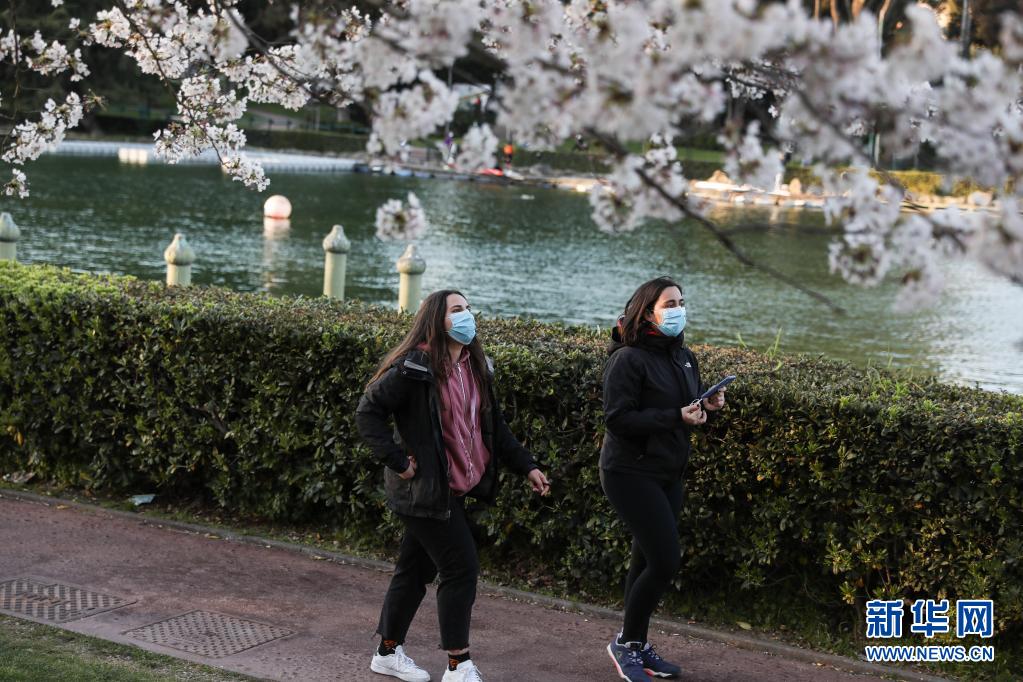 3月24日,佩戴口罩出行的市民從意大利首都羅馬盛開的櫻花樹下走過。