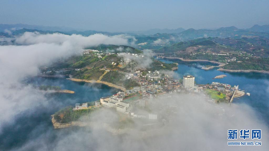 3月28日拍攝的云霧中的流水鎮(無人機照片)。