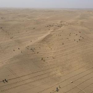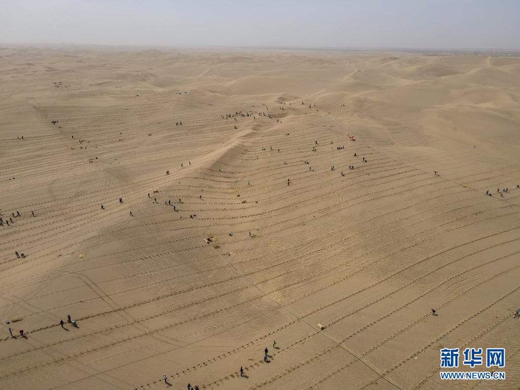 3月28日,人們在且末縣城不遠處的塔克拉瑪干沙漠內植樹(無人機照片)。