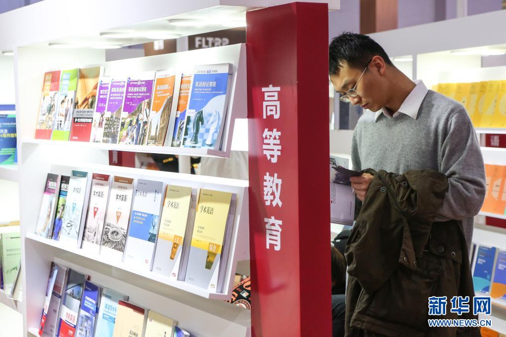 3月31日,參展人員在外研社展位瀏覽書籍。