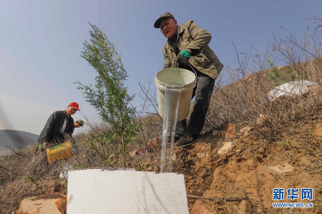 3月31日,造林隊員在河北省遵化市石門鎮金星山給新栽的樹苗澆水。