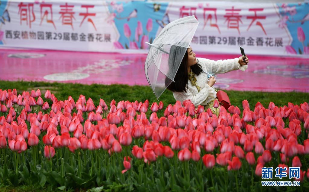 4月1日,游客在西安植物園郁金香展區自拍。
