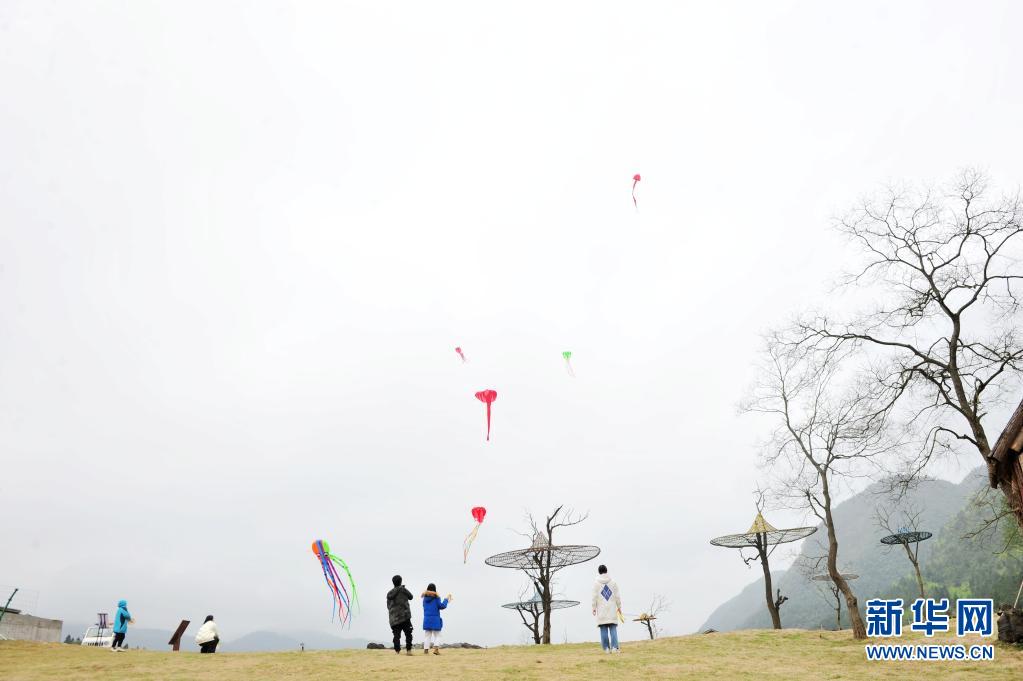 4月5日,游客在重慶市酉陽土家族苗族自治縣疊石花谷生態旅游景區放風箏。
