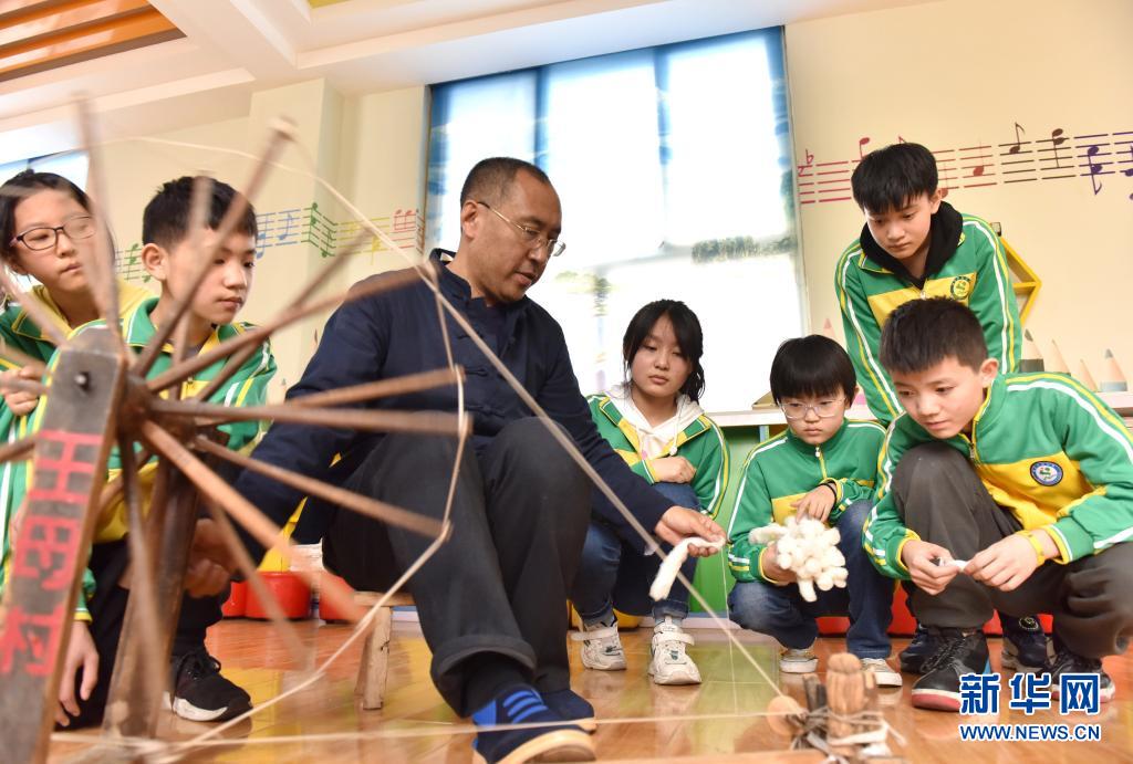 4月7日,威縣土布紡織技藝傳承人高慶海在威縣第四小學向學生演示老粗布紡織技藝。近年來,河北省邢臺市威縣積極開展“非遺傳承進校園”活動,將當地特色非遺項目引入學校課堂,讓學生近距離感受民間傳統技藝的魅力,促進非遺文化的保護和傳承。新華社記者 朱旭東 攝