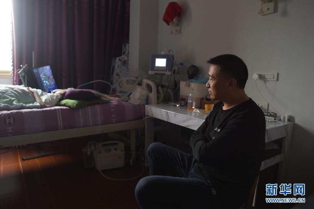 父親包宗鋒坐在床邊隨時(shí)“待命”(4月13日攝)。包宗鋒被檢查出腦血管畸形,因?yàn)橐湛春⒆樱恢辈桓胰プ鍪中g(shù)。