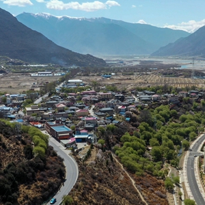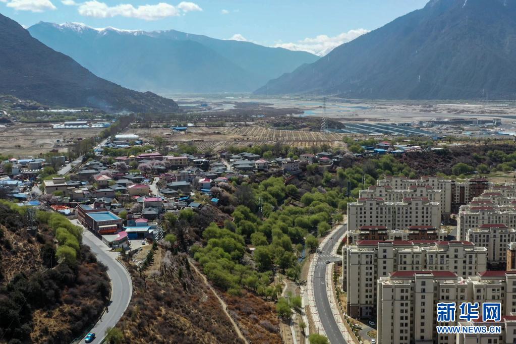 這是西藏林芝市巴宜區巴吉村(畫面左側)及毗鄰的八一鎮(4月6日攝,無人機照片)。新華社記者 洛卓嘉措 攝