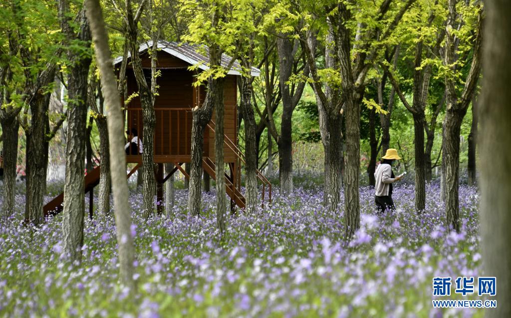 4月24日,市民在北京北臧村鎮綠色港灣園區賞花。
