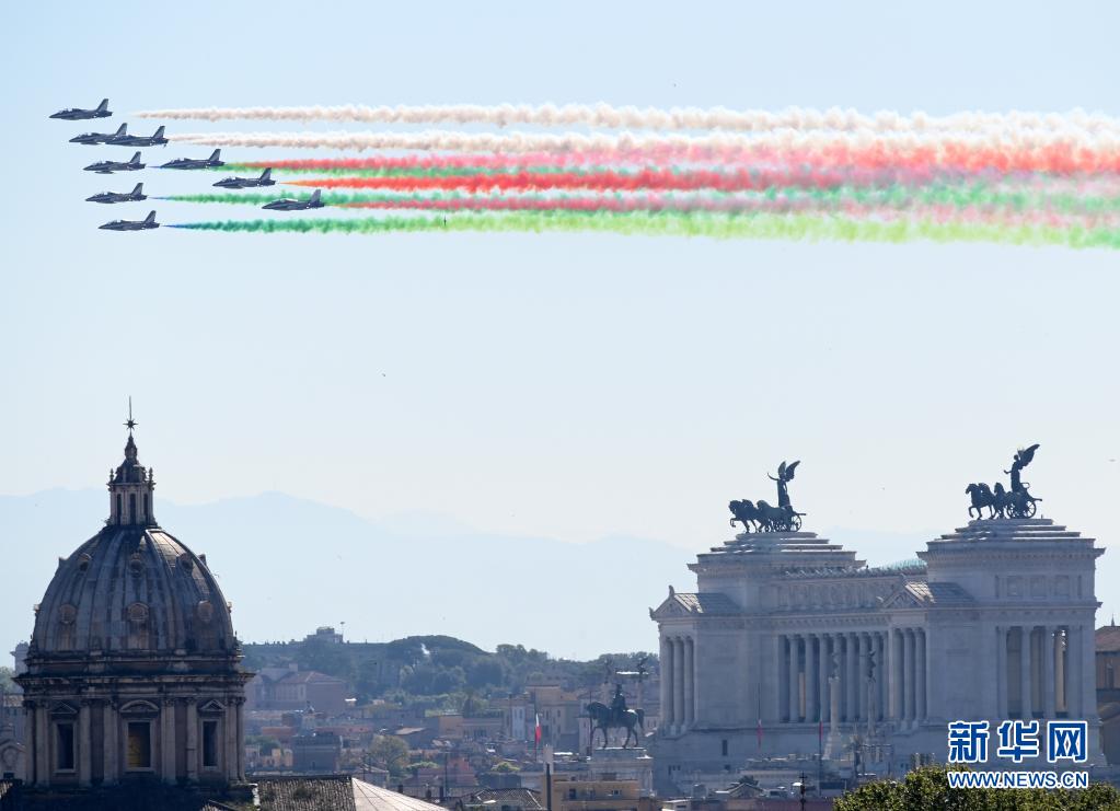 4月25日,意大利“三色箭”飛行表演隊在羅馬舉行的紀念儀式上噴出代表意大利國旗顏色的紅白綠三色煙霧。