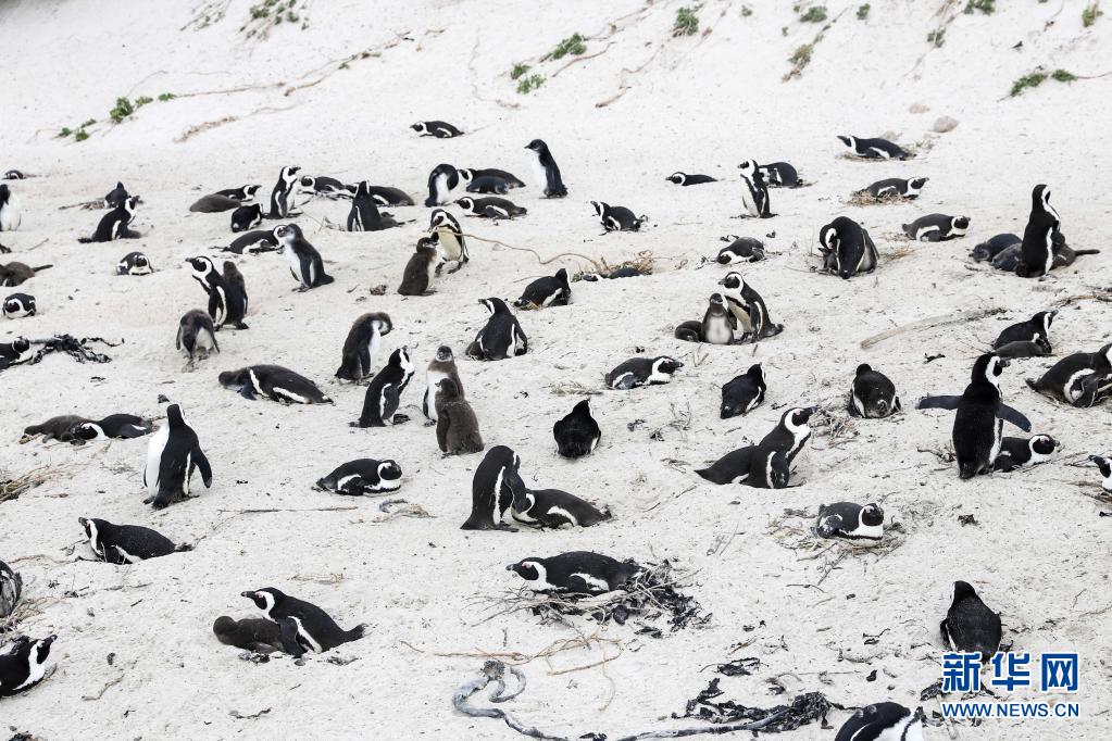 4月25日,一群非洲企鵝在南非西蒙鎮企鵝灘上行走。