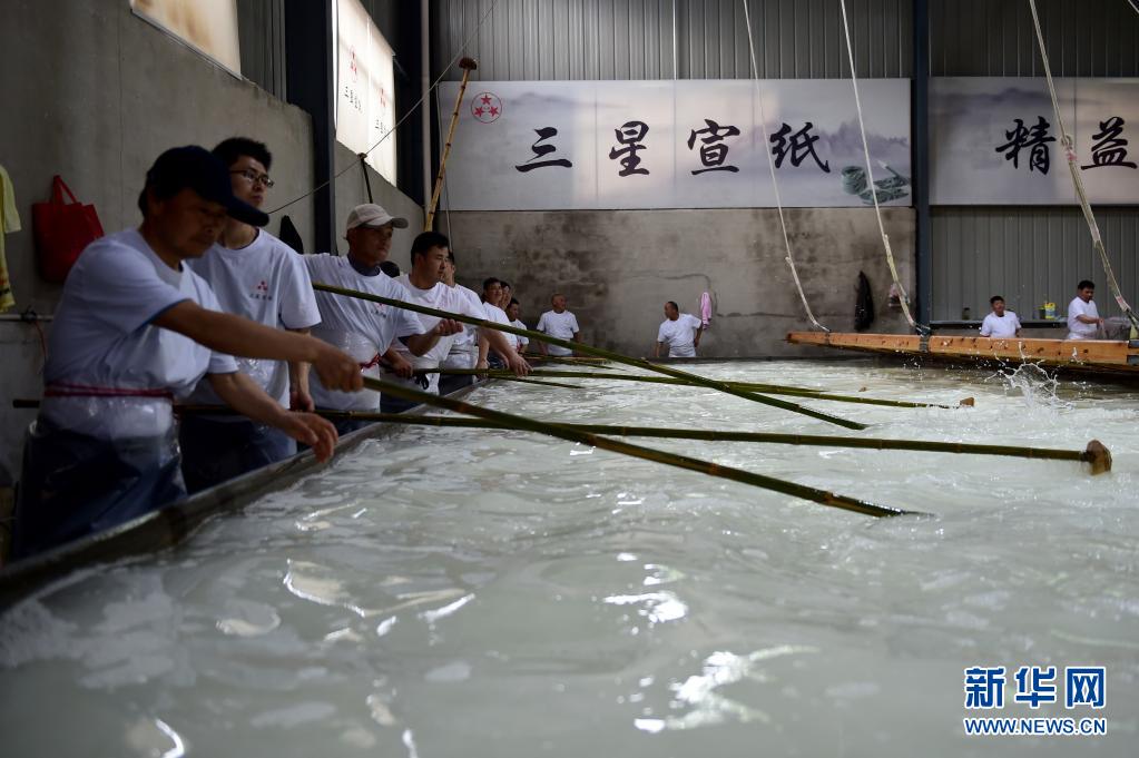 近日,在宣紙產地安徽省宣城市涇縣,“四丈宣紙”的抄制在一家紙業有限公司啟動。50余名撈紙師傅操作巨型紙簾,齊心協力,在紙槽旁進行撈紙作業。來回起落兩次,動作整齊劃一。隨后工人們將紙簾吊起放至一邊揭下,一張巨大的宣紙便撈制成功。經過曬、剪等工序后, 制成長13.2米、寬3.6米的巨型宣紙就是“四丈宣紙”。
