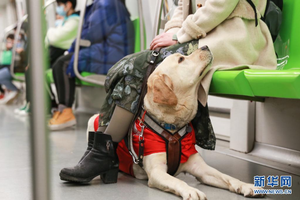 導盲犬“Bingo”陪伴李靜乘坐地鐵(3月27日攝)?! ⌒氯A社發 (張夢 攝)