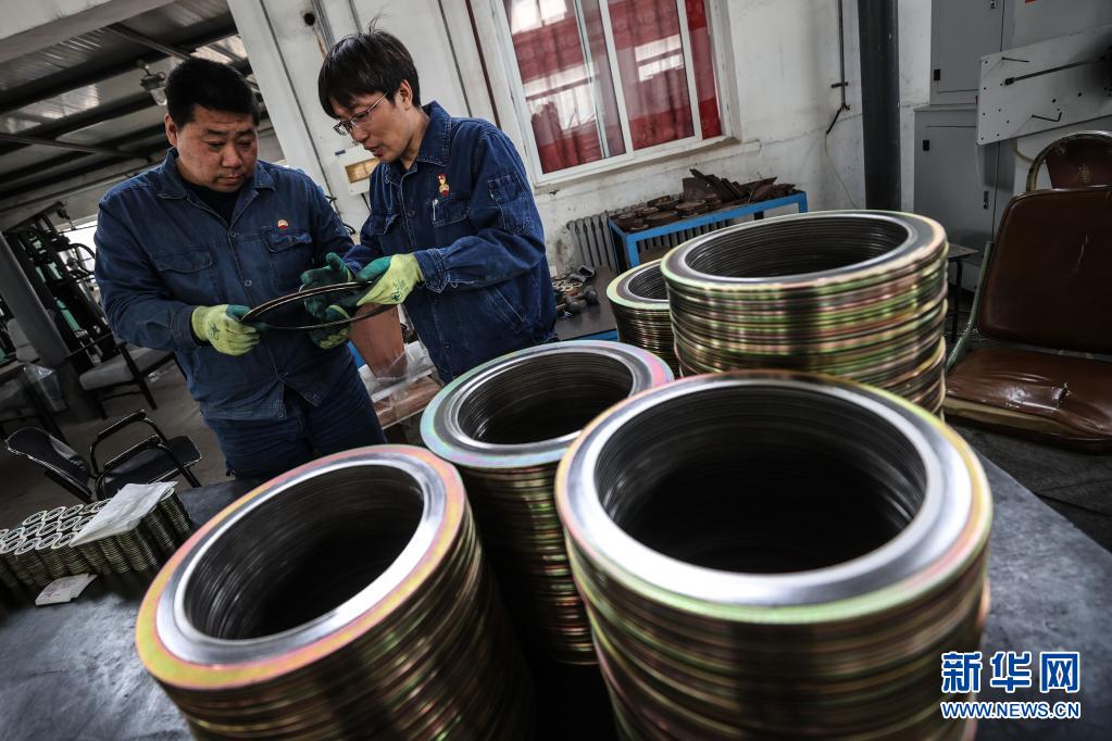 4月30日,王尚典(右)與同事在檢查生產的墊片產品是否合格。