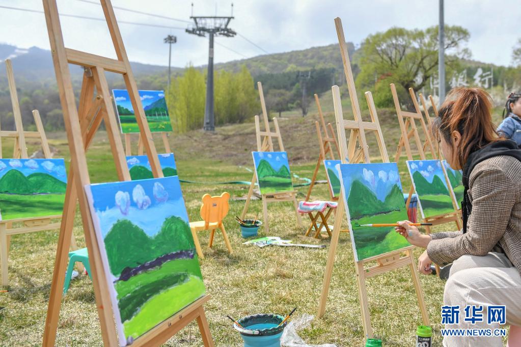 5月1日,在吉林市萬科松花湖度假區,游客在山坡上繪畫寫生。