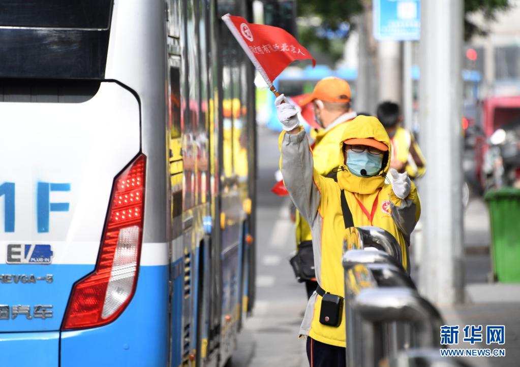 5月6日,在北京市一處公交車站,公共文明引導員在大風中引導公交車進站。