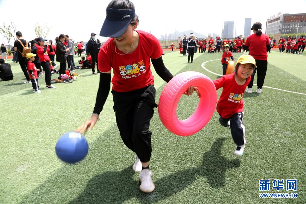 5月9日,在江蘇連云港一所幼兒園的母親節(jié)親子活動中,一名小朋友和母親一起參加比賽。
