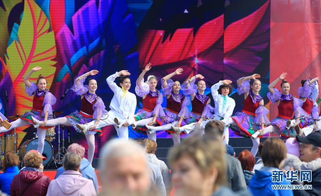 5月9日,演員在白俄羅斯首都明斯克勝利日節慶活動現場進行文藝表演。