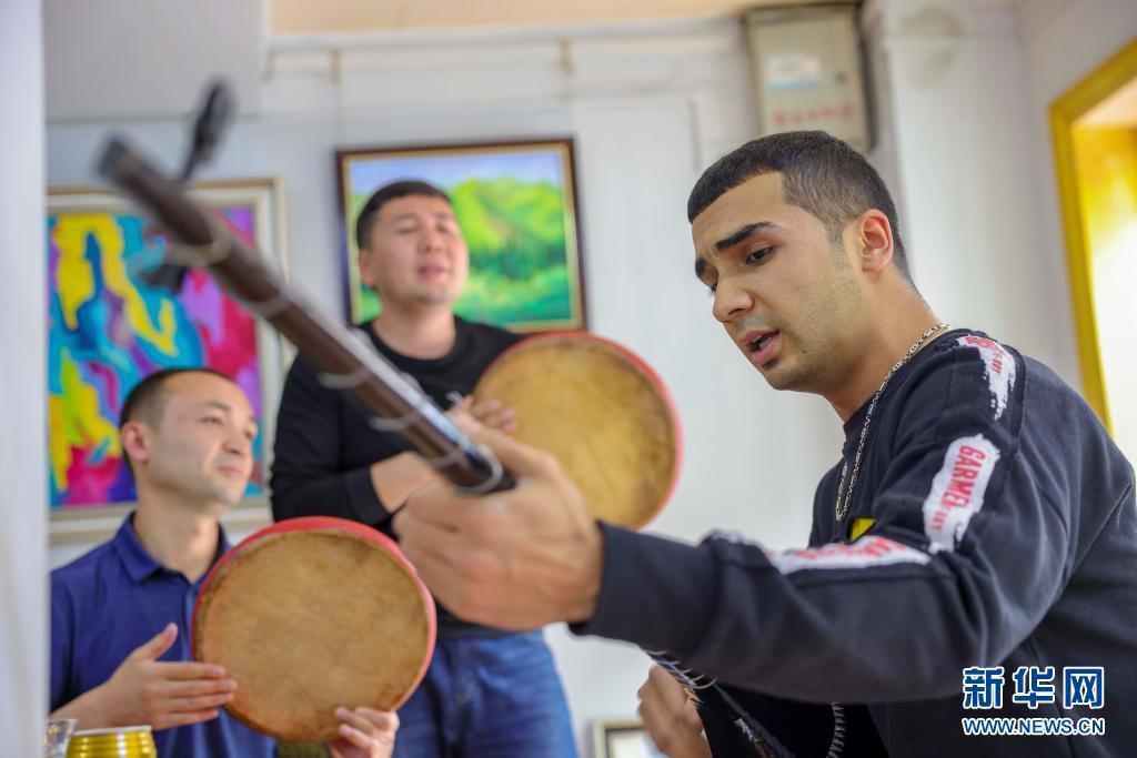 麥麥提吐?tīng)栠d江·麥麥提依明(右)在工作室內(nèi)和朋友唱歌(5月5日攝)。新華社記者 胡虎虎 攝