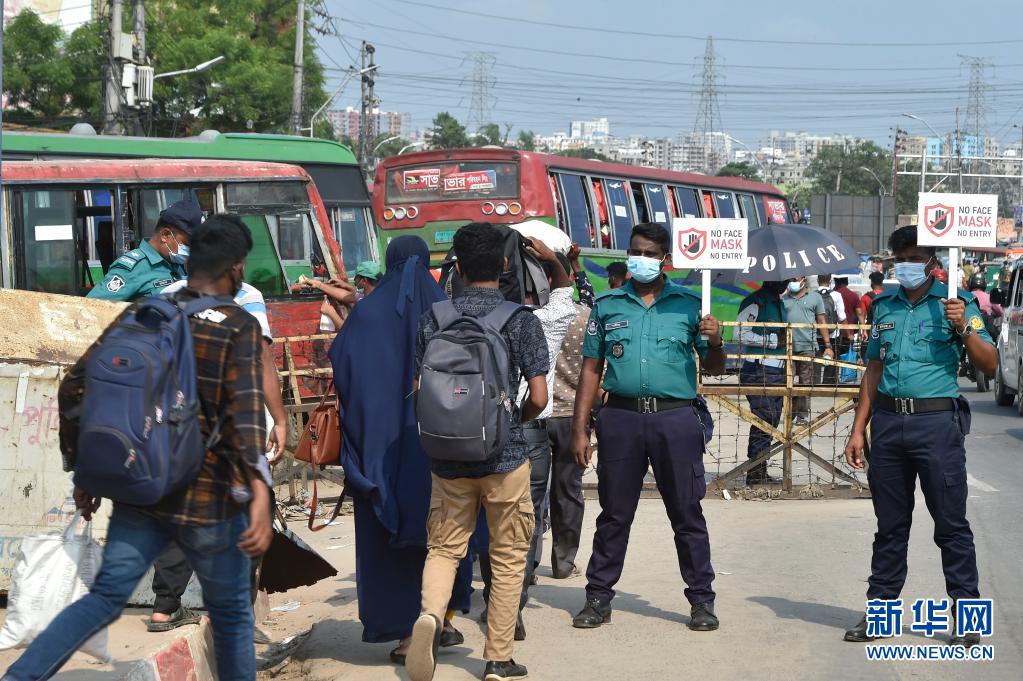 5月17日,警察在孟加拉國首都達卡的車站手舉佩戴口罩的提示牌,要求從各地返回達卡的人們注意防護安全。