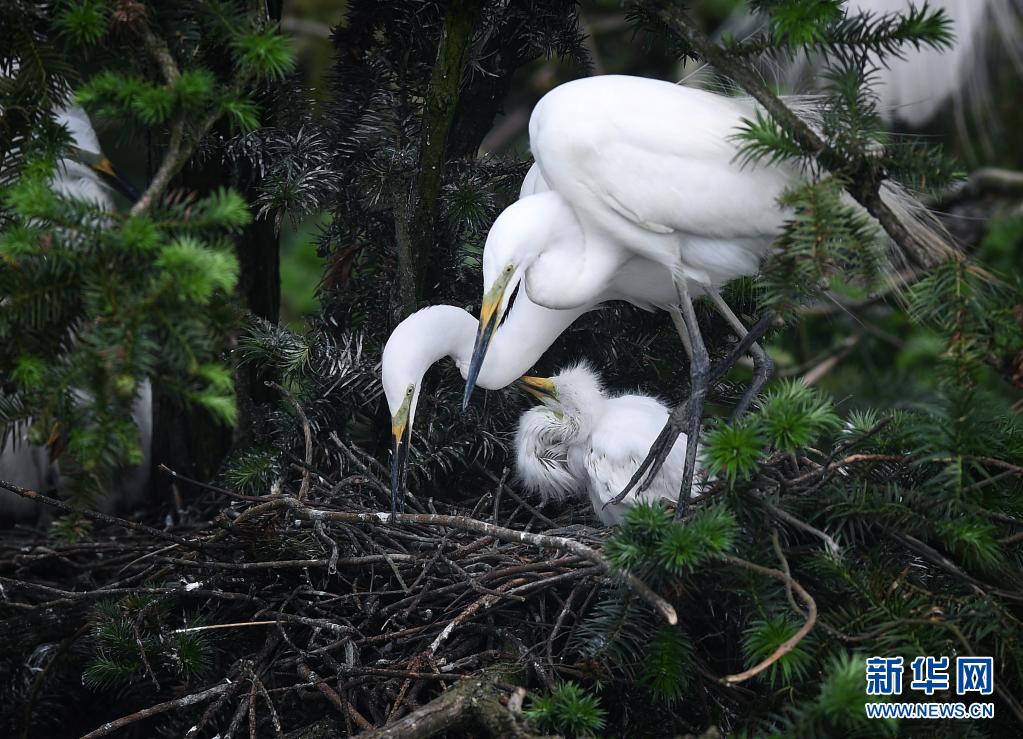 在南昌市新建區(qū)象山森林公園內(nèi),白鷺和雛鳥(niǎo)們?cè)谝黄穑?月18日攝)。
