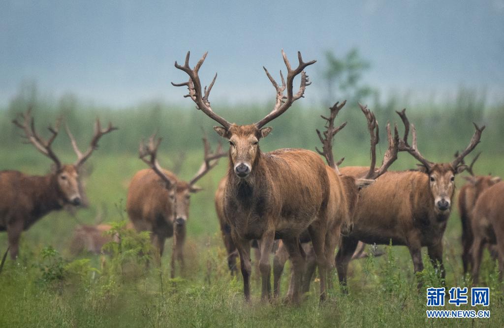 5月17日,一群麋鹿在石首麋鹿國家級自然保護區(qū)內(nèi)活動。