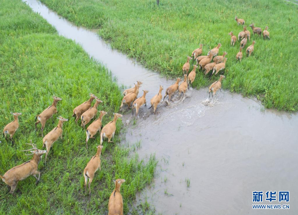5月17日,一群麋鹿在石首麋鹿國(guó)家級(jí)自然保護(hù)區(qū)內(nèi)活動(dòng)(無(wú)人機(jī)照片)。新華社記者 肖藝九 攝