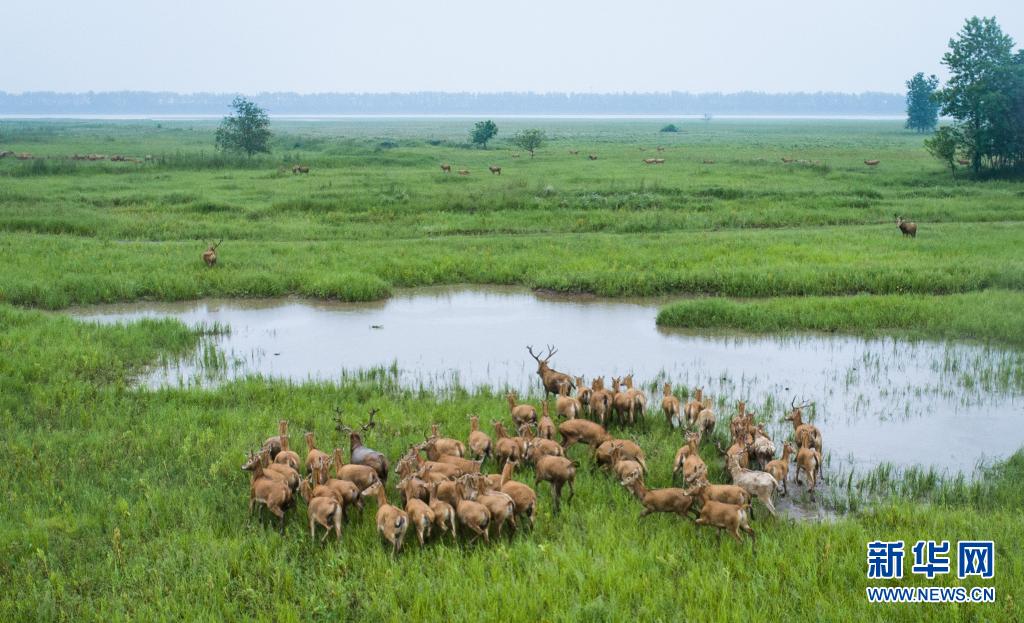5月17日,一群麋鹿在石首麋鹿國家級自然保護區內活動(無人機照片)。新華社記者 肖藝九 攝