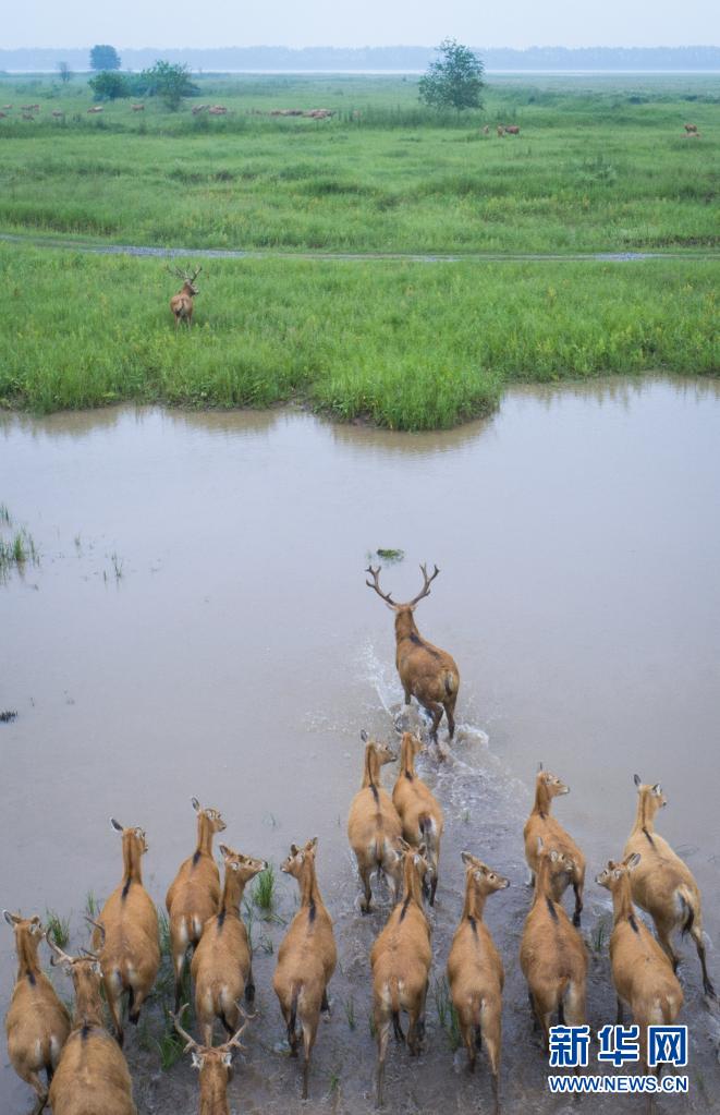 5月17日,一群麋鹿在石首麋鹿國家級自然保護(hù)區(qū)內(nèi)活動(無人機照片)。新華社記者 肖藝九 攝