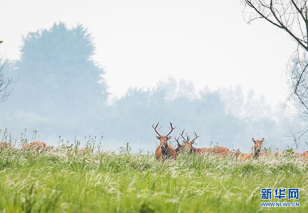 5月17日,一群麋鹿在石首麋鹿國家級自然保護(hù)區(qū)內(nèi)活動。新華社記者 肖藝九 攝