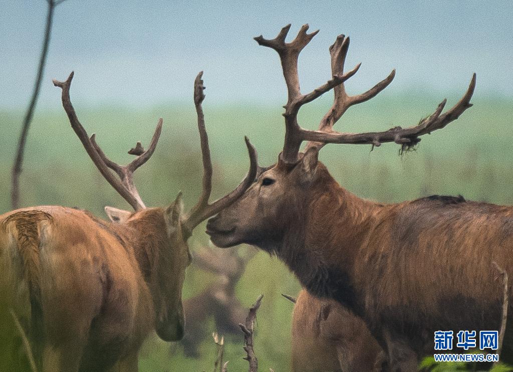 5月17日,麋鹿在石首麋鹿國家級自然保護區內活動。新華社記者 饒饒 攝