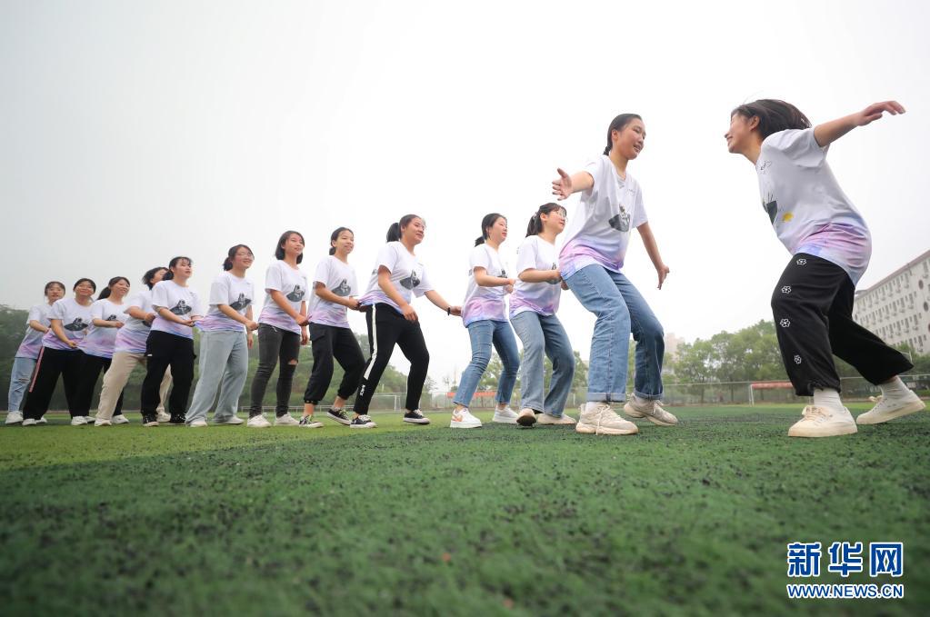 5月25日,湖南省衡陽市衡陽縣第一中學的高三學生在晨練中玩老鷹捉小雞游戲。
