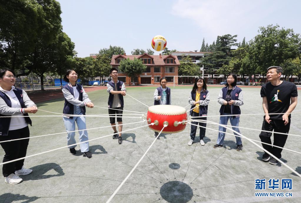 5月25日,江蘇省蘇州市第五中學的高三學生在玩“同心鼓”游戲。