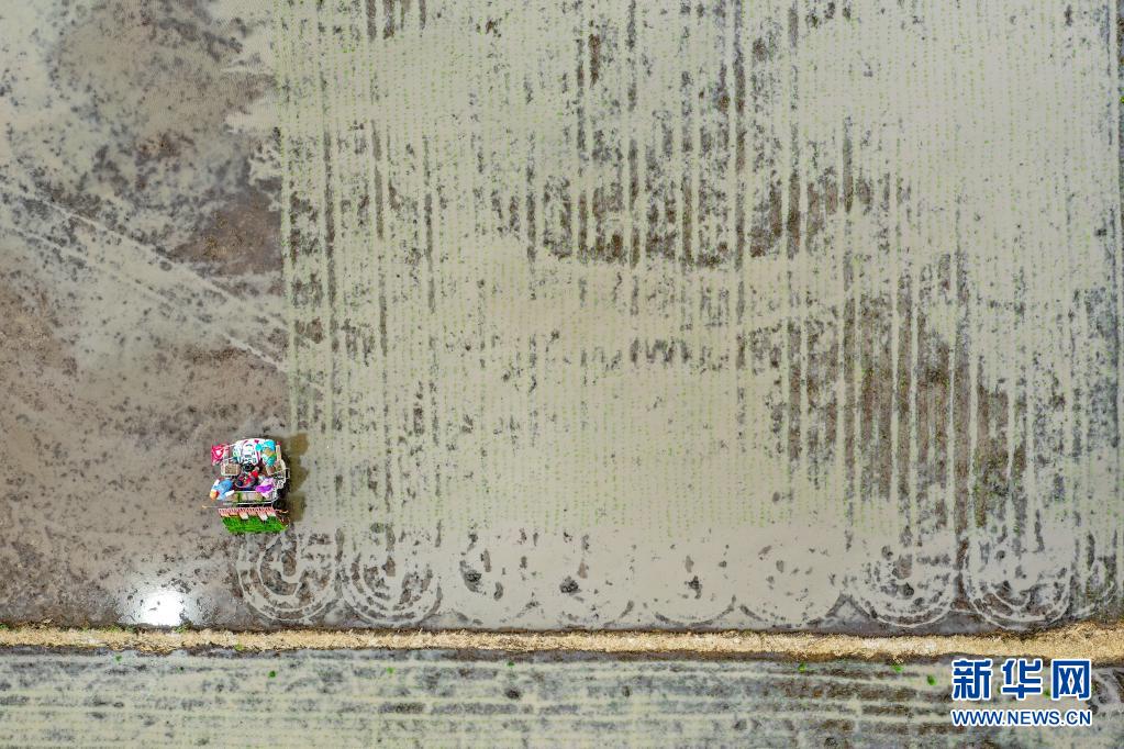 5月27日,在吉林省吉林市永吉縣一拉溪鎮九月豐家庭農場,農民駕駛農機進行水稻插秧(無人機照片)。
