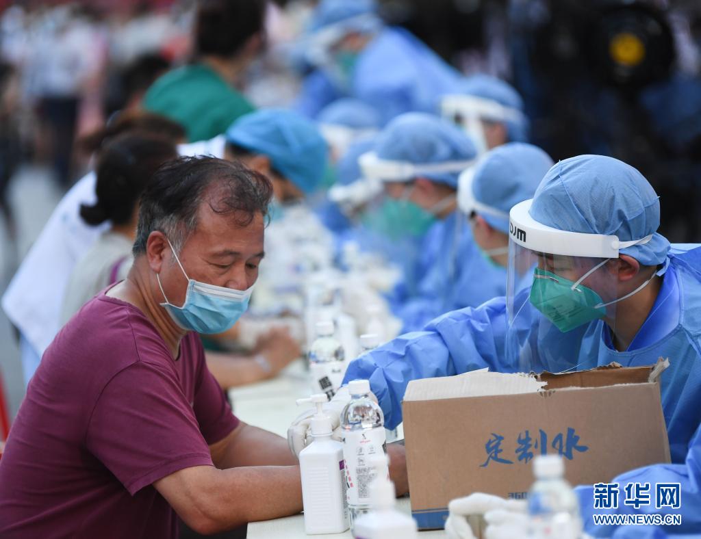 5月27日,在廣州荔灣區廣鋼新城核酸臨時采集點,南方醫科大學南方醫院的醫務人員核對市民信息。新華社記者 鄧華 攝