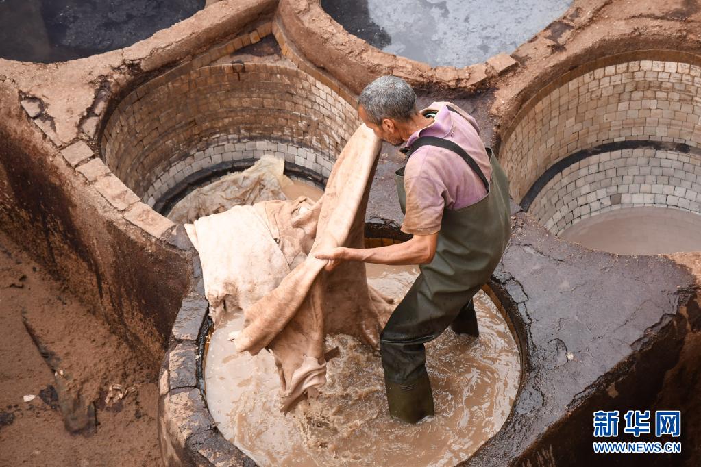 5月30日,工人正在摩洛哥非斯古城內(nèi)的皮革染坊中勞作。
