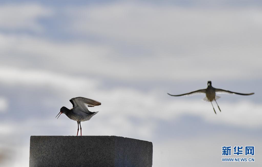 初夏,紅腳鷸在位于西藏拉薩的拉魯濕地國家級自然保護區內起舞覓食。