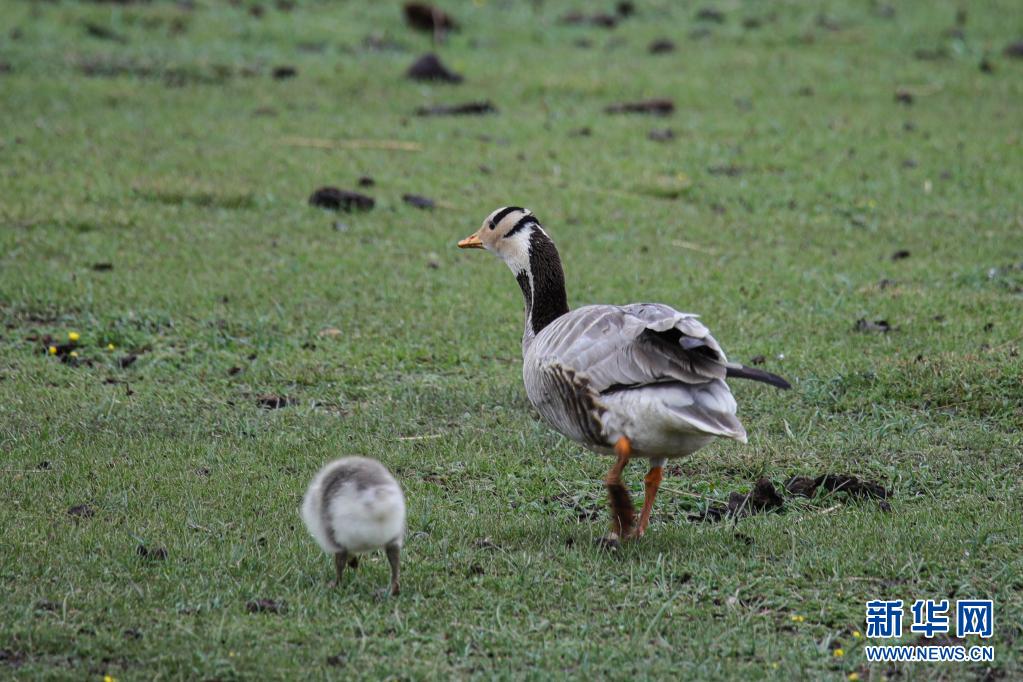 這是6月2日在甘肅省甘南藏族自治州碌曲縣尕海湖拍攝的斑頭雁及其幼鳥(niǎo)。