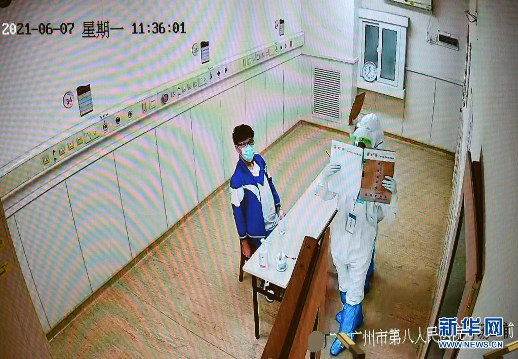6月7日,廣東省國家教育考試指揮中心的監控畫面顯示,上午語文考試結束后,廣州市八醫院嘉禾院區醫護人員對隔離病房考生的試卷、答題卡、稿紙等用品進行消毒后裝入試卷袋并向在醫院清潔區的視頻監考員匯報。新華社記者 劉大偉 攝
