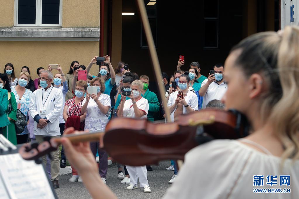 當日,羅馬尼亞首都布加勒斯特一個樂隊在該國一家傳染病醫院——馬太·巴爾什醫院演出,向抗擊新冠疫情的醫務工作者致謝。