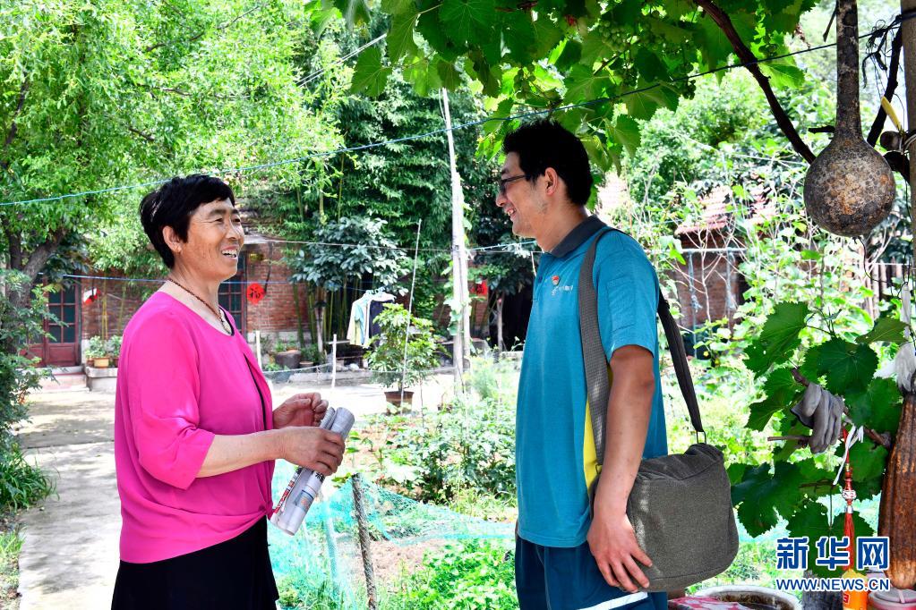 6月20日,在微山縣南陽鎮,郵遞員王少朋(右)和柳溝村村民交談。