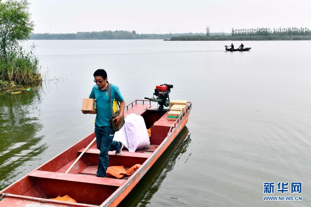 6月20日,在微山縣南陽鎮丁樓村,郵遞員王少朋將郵船停穩后,帶上郵件為村民投遞。