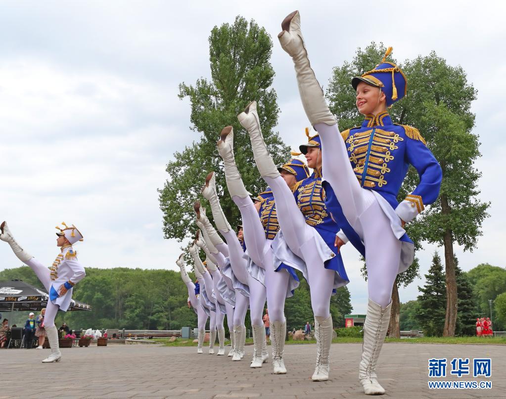 7月3日,演員在白俄羅斯首都明斯克街頭表演舞蹈。