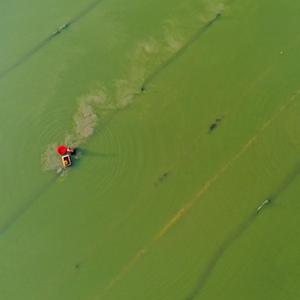 7月5日,在湖南省永州市道縣蚣壩鎮洲背村,村民在收獲小龍蝦(無人機照片)。