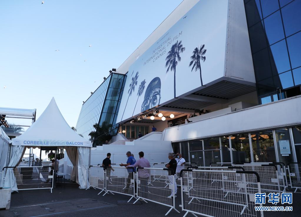 7月5日,工作人員在法國戛納的電影宮外為開幕式做準備。